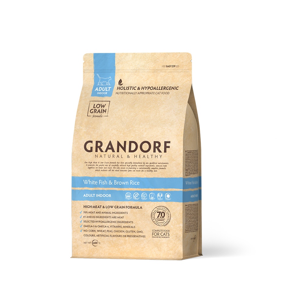 GRANDORF SINGLE GRAIN CAT ADULT SKIN & COAT CARE WHITE FISH & TURKEY низкозерновой для взрослых кошек с чувствительной кожей и шерстью с белой рыбой и индейкой (0,4 кг)